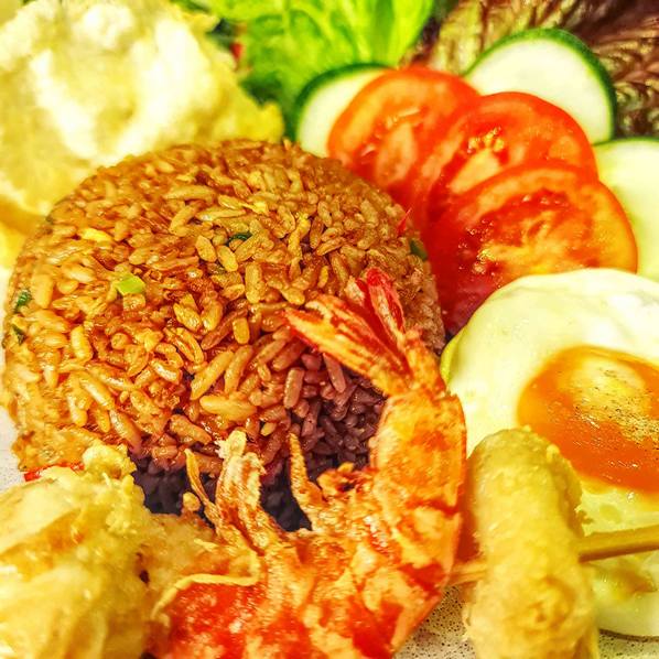 Nasi Goreng Seafood Fried Rice comes with Seafood Skewer, Over Easy Egg, Pickles and Crackers Rp 98.000 Available - +