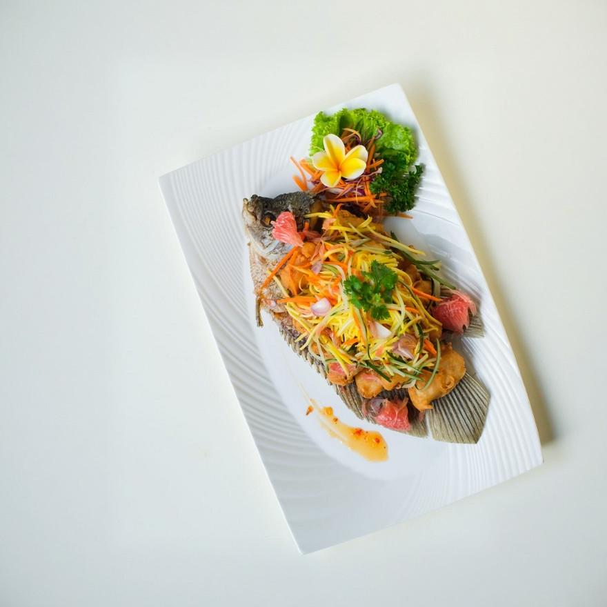Gurame Rujak Pencit Fried Gouramy fillet served with Shredded mango salad (Sharing menu) | Rp 289.000 Available - +